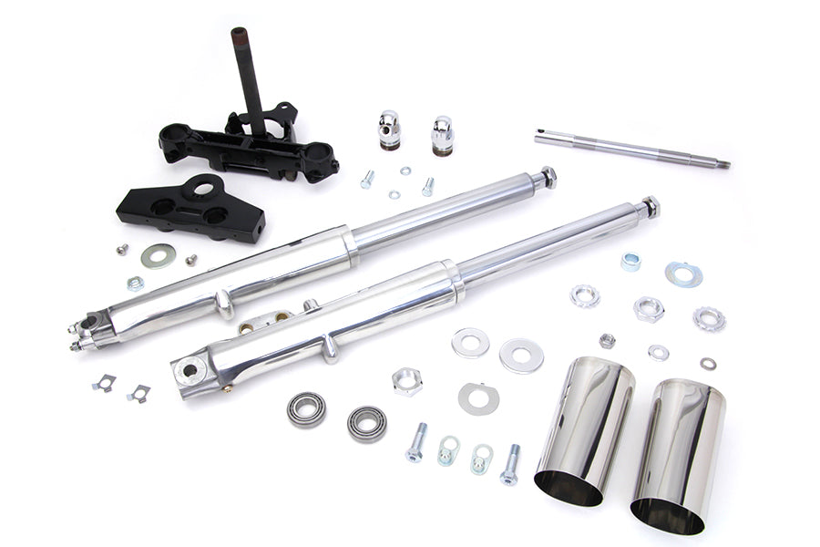 | Hard chrome 41mm adjustable fork tube assembly with polished sliders includes black adjustable rake triple tree set. Includes polished sliders with the internals installed stainless slider covers axle and nut fork bearings and cone nut installed. Assembly is disc brake type. This assembly can also be used on 1971-1984 FX and 1948-1969 FL models. |