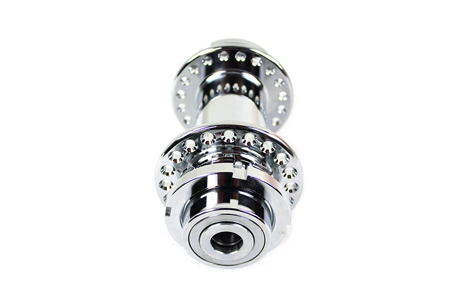 | 750 XR rear wheel hub is chrome plated and includes 2 nuts. For 40 spoke hole rims. Features knock off threaded end for quick change rear sprockets. Includes 11/16 bearings to fit stock sportster axles that are pre 1979 models and one chrome lock nut. Accepts 11/16 axle shaft and 6-8 gauge spokes. Accepts 38 tooth splined rear sprocket 49 tooth splined engine sprocket and 51 tooth splined engine sprocket. *NOTE: Alloy splined adapter is for sprocket and disc mounting. Disc mounting is a very close fit and should be tapped with rubber mallet - being careful not to damage splines. Order additional set of XR 750 hub lock nut separately. |